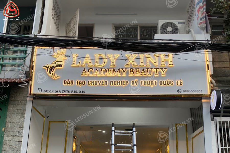 Lady Xinh Academy Beauty – Phường Hoà Hưng, Quận 10 Led Sun sử dụng nền alu nhám, chữ nổi inox vàng gương – vật liệu được ưa chuộng trong ngành làm đẹp vì hiệu ứng ánh kim bắt mắt. Phần chân chữ là mica trắng sữa cháo sáng, cho ra ánh sáng nhẹ nhàng và không chói mắt. Bảng hiệu vừa tạo ấn tượng mạnh vào buổi tối, vừa thể hiện tính thẩm mỹ chuyên nghiệp của một học viện làm đẹp.