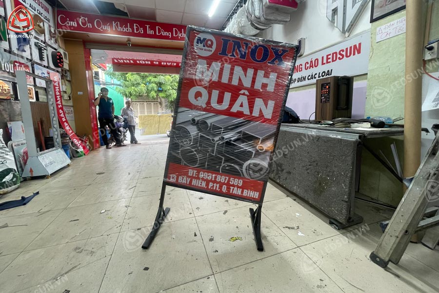 Standee dán decal 2 mặt là bảng quảng cáo sử dụng chất liệu alu bền bỉ, được dán decal hiển thị nội dung trên cả hai mặt. Với khung chân chắc chắn, loại standee này phù hợp dùng trong nhà và ngoài trời, giúp tối ưu hóa khả năng quảng bá từ nhiều góc nhìn. Standee alu dán decal 2 mặt thường được sử dụng để quảng cáo sự kiện, trưng bày sản phẩm, hoặc làm bảng chỉ dẫn, mang lại tính thẩm mỹ và hiệu quả cao.